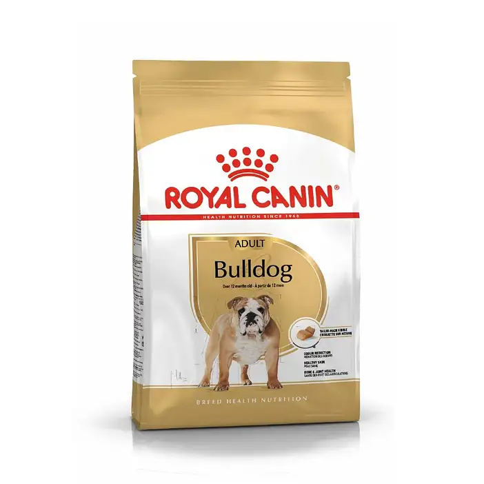Royal Canin English Bulldog Adult dog food is specifically formulated to motivate your bulldog to chew and it contains the best protein sources with tailor-made kibbles to fit their jaw. The English Bulldog Adult dog food variety is suited for bulldogs over 12 months old.